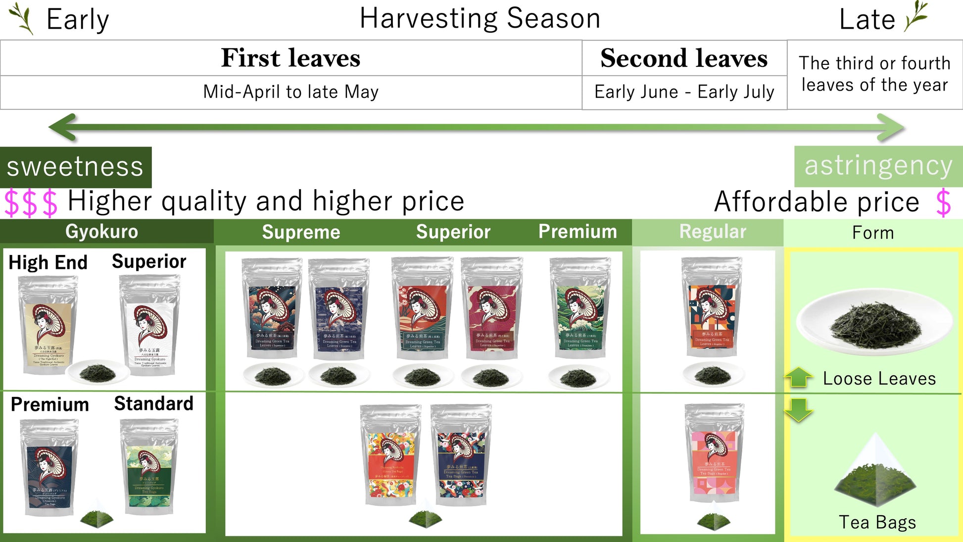 Tanto el té Hoshino como el té Yame son tés verdes de alta calidad producidos en la prefectura de Fukuoka, Japón. A pesar de sus similitudes, cada uno tiene características distintivas. A continuación, se ofrece una explicación detallada de sus diferencias: