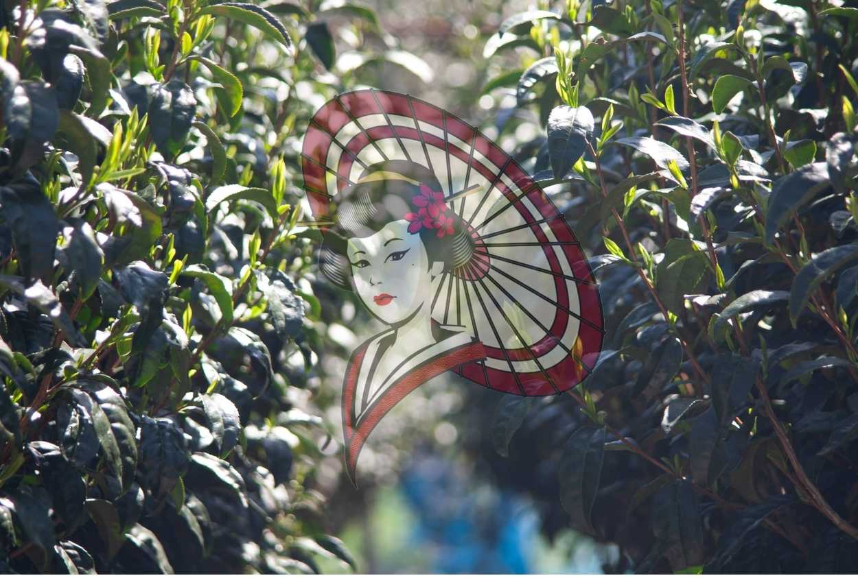 A quiet path between tea plants, softly illuminated, inviting calm and contemplation.